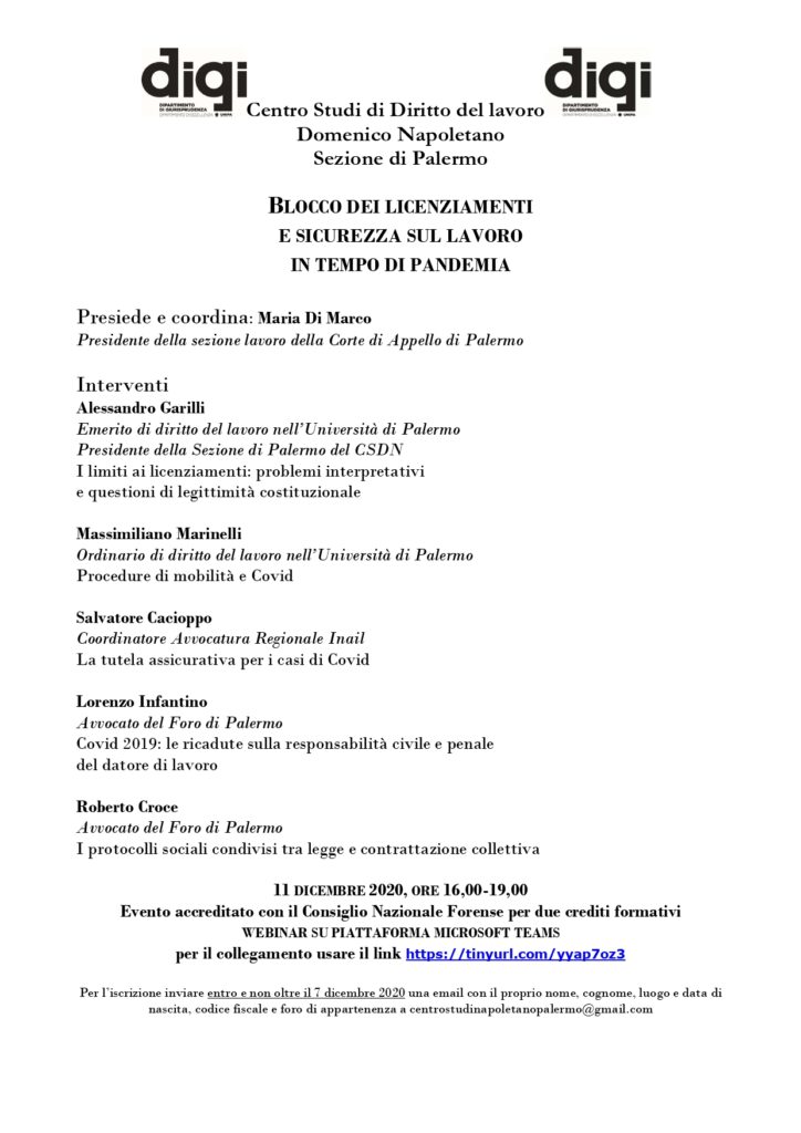 Relazione al Convegno dell’11.12.2020 “Blocco dei licenziamenti e sicurezza sul lavoro in tempo di pandemia” – Centro Studi di Diritto del Lavoro “Domenico Napoletano” – Sezione Palermo