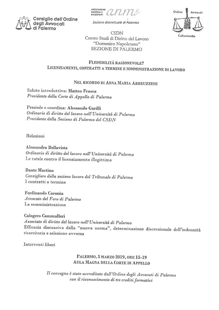 Il giorno 5 marzo 2019 presso l’aula magna della Corte di Appello di Palermo si è tenuto il convegno in ricordo di Anna Maria Abbruzzese dal titolo “Flessibilità ragionevole? Licenziamenti, contratti a termine e somministrazione di lavoro”.